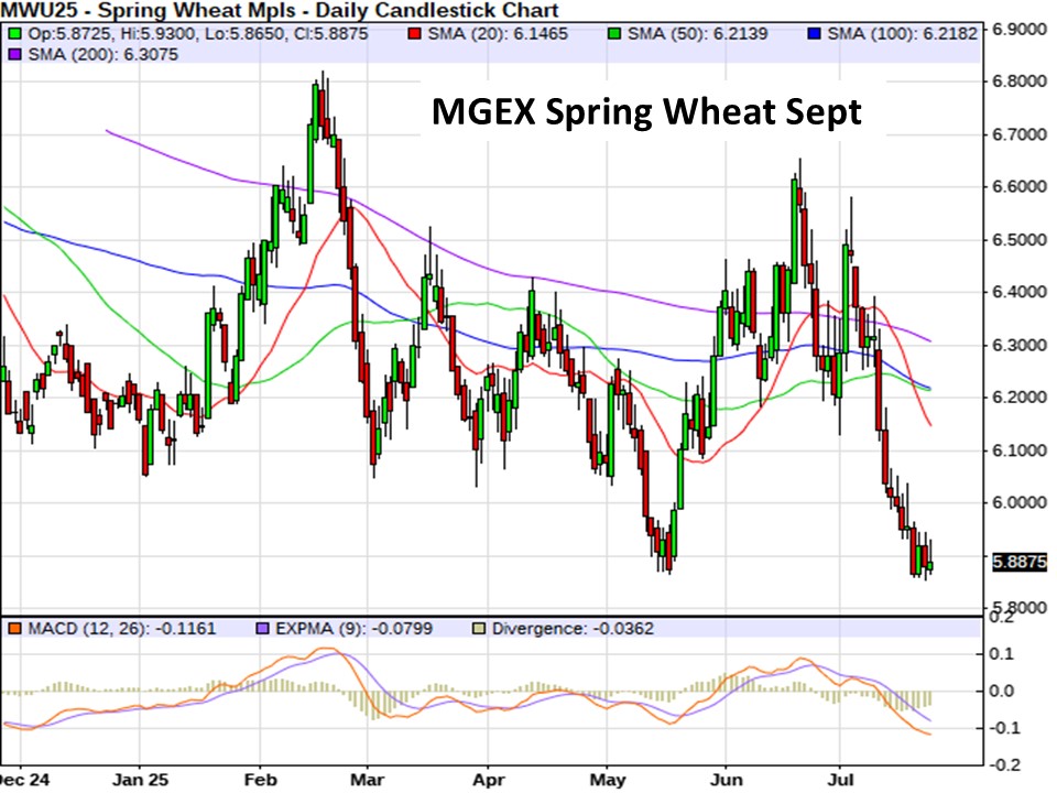 Minnie spring wheat futures are up a modest 0.75 of a cent this morning at $5.89/bu, suffering a notable sell-off since the start of the month to now languish at its contract low territory posted in May.