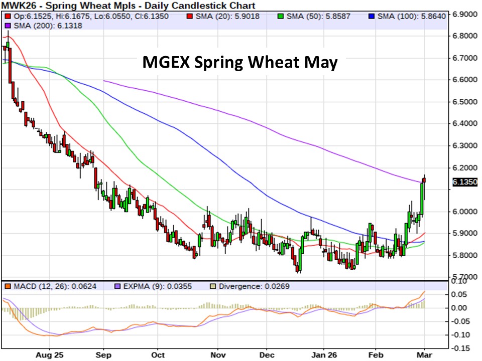 US wheat markets are mixed this morning… Minnie spring wheat futures are mostly around a penny higher, HRW is up 3 to 4 cents, but SRW wheat is mostly 2 to 3 cents lower. The US wheat complex rallied across all three markets on Friday to lead the grain complex. Spring wheat futures posted 8 to 15.75 cent gains last week, with the May contract up 12.75 cents. Short covering was noted to close out February.