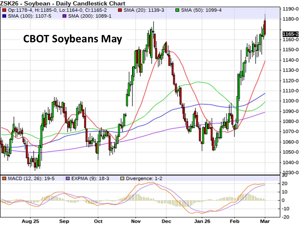 Soyoil futures are blasting higher this morning…soaring 134 to 165 points higher to fresh contract and 2-year highs. Crude oil is generating bullish spillover momentum this morning following the US/Israel strikes on Iran over the weekend. But soybeans are under pressure over uncertainty on US/China relations.