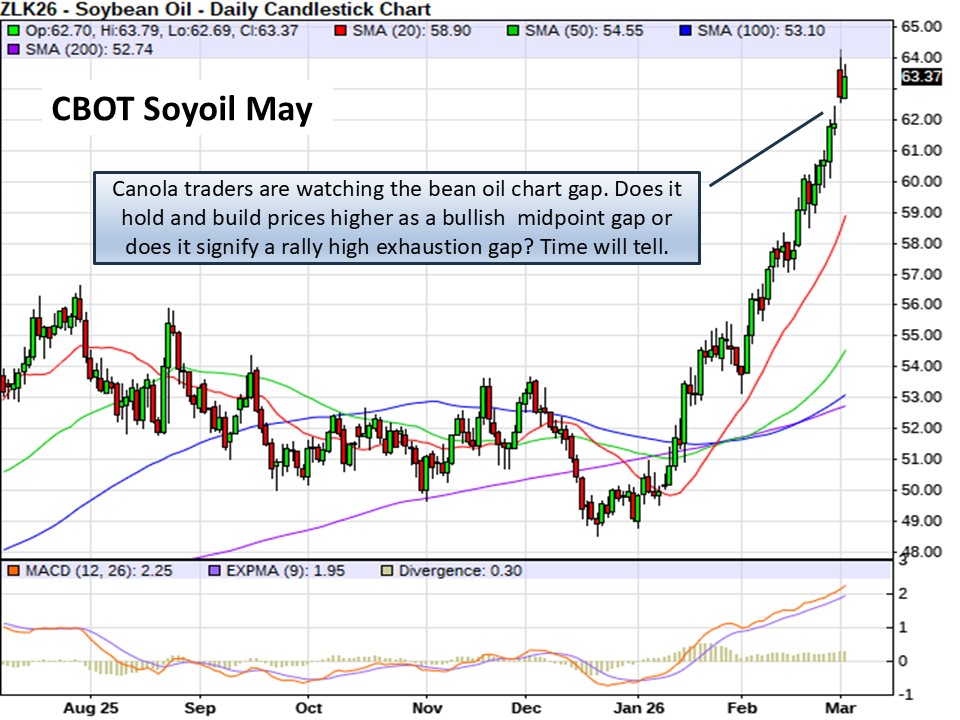 The gap in soyoil futures to start this week is something to watch for canola traders…something that will play a key role technically in canola’s price outlook. An exhaustion gap versus a midpoint gap has differing chartist interpretations.
