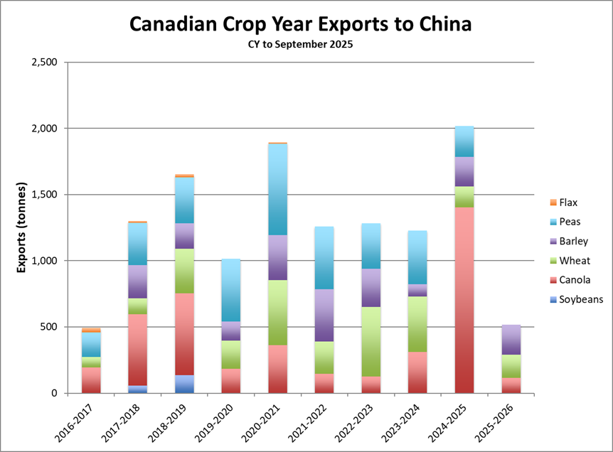 That has seen China s purchases of canola seed from Canada tumble to a mere 113,900 tonnes compared to more than 1.4 MMT a year ago. Peas held at zero, while those imports were 233,000 tonnes the previous September. Added to that, China s imports of Canadian lentils were also at zero versus 20,700 tonnes last September.
