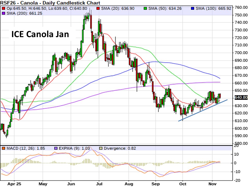 For today… after staying closed Tuesday for Remembrance Day, canola futures are trading $4 to $5/tonne lower to start this morning. Benchmark Jan futures are $4.90 weaker at $640.60/tonne…but still trying to grind higher over the past month of trade and still holding above both its 20- and 50-day moving averages.