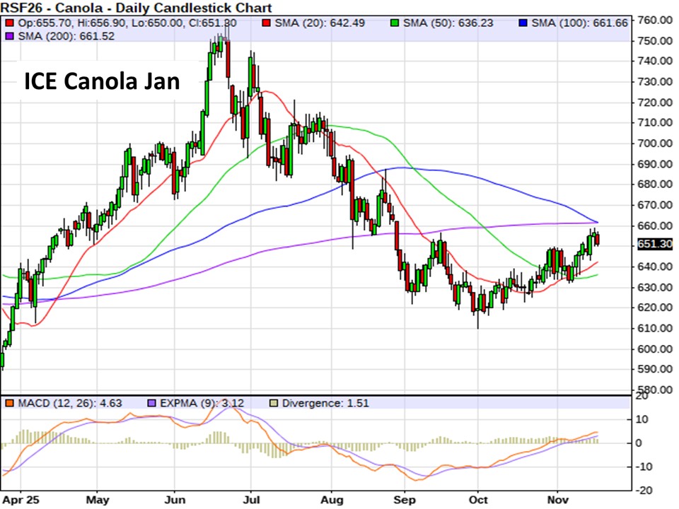 For today… canola future are retreating mostly $4 to $5/tonne lower this morning, scratching near the lows of the overnight session. Benchmark Jan canola remains in a short-term uptrend off its early October lower, but the contract is down $5.60 this morning at $650.80/tonne…trying to stay above recently cleared resistance at the $650 level, but so far unable to crack the next overhead target around $662 where the 100- and 200-day averages are currently converging. Still bullish technical signal…the 20-day average recent crossed up and over the 50-day…suggestive of a harvest low already made.