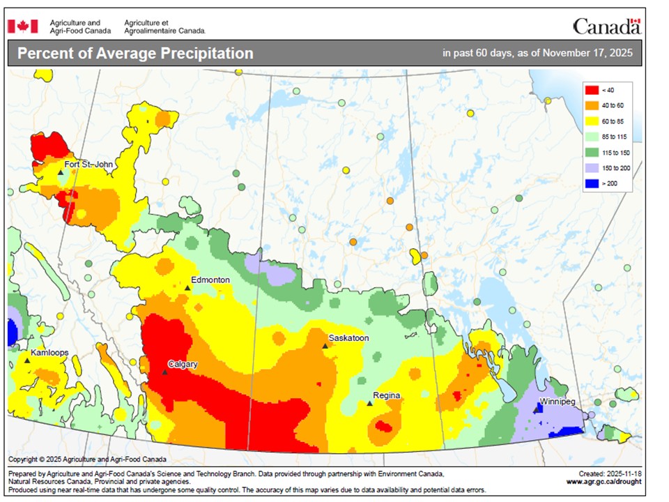 According to the latest monthly update of the Canadian Drought Monitor last week, abnormal dryness or some form of drought was impacting 68% of Prairie agricultural lands as of the end of October. That s up 4 points from September and above 59% in August but still well below 81% in July.