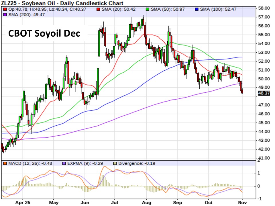 Bean oil is down yet again…pushing below 49 cents/lbs…on continued spreading with soymeal not helping. It still appears to be selling related to either the delays in increasing US biofuel demand thanks in part to the government shutdown and/or concerns that improved relations with China will result in additional used cooking oil imports. Regardless of the cause, support at 50 cents/pound failed to hold prices up…chart looks bearish.