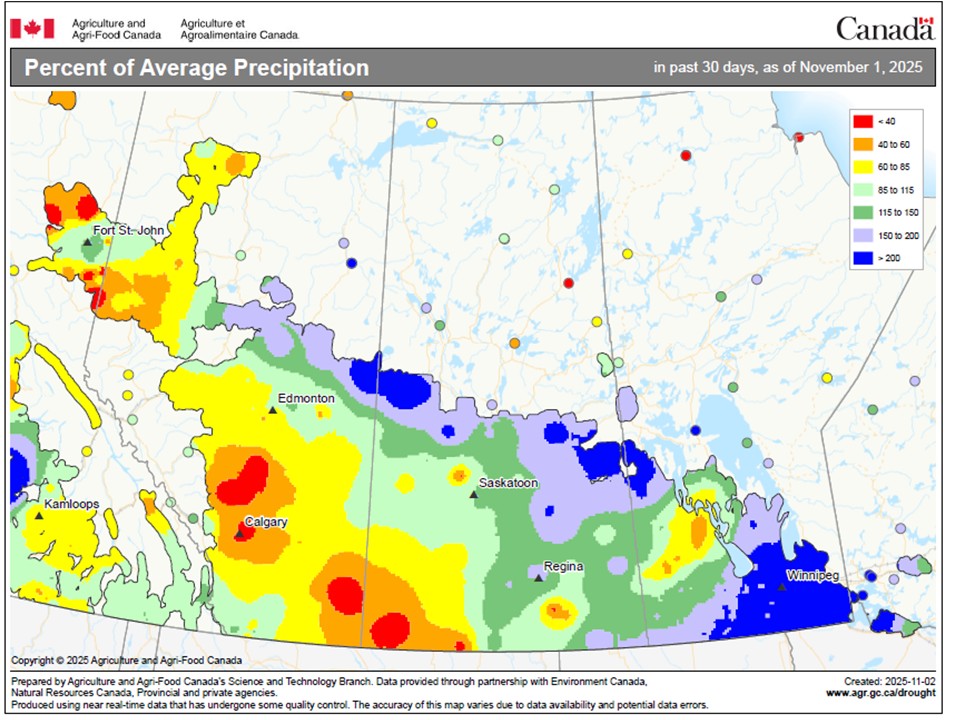 – Western Prairies shortchanged on precip Again in October… Much of the western Canadian Prairies was drier than normal through October, further increasing the need for moisture going into the winter. As shown on the 30-day map below, most of Alberta and western Saskatchewan remained stuck in the same dry pattern that has dominated the fall season in particular. The 60-day map shows an even starker divide between the drier western Prairie and the eastern areas, where precipitation has been more plentiful.