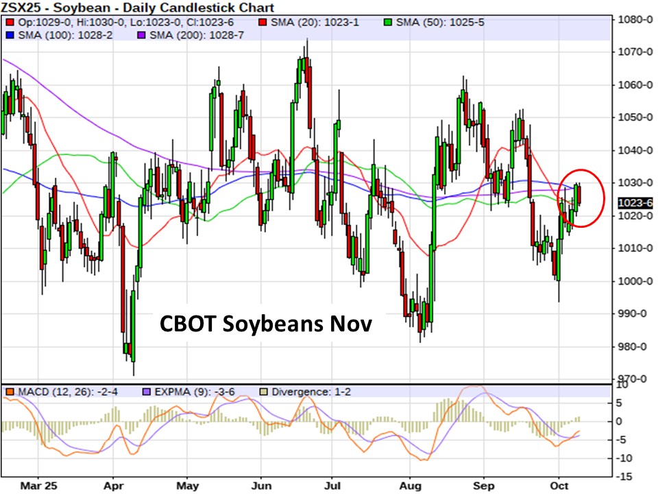 Chicago soybean futures are trading 4 to 5 cents/bu weaker to start this morning, peeling back a bit from its recent advance to 3-week highs. The soybean market posted gains of 4 to 7 cents on Wednesday, led by the front months. Nov bean futures are down 5.75 cents this morning at $10.24/bu…caught up in a cluster of moving averages (20-, 50-, 100- and 200-day) offering both support and resistance.