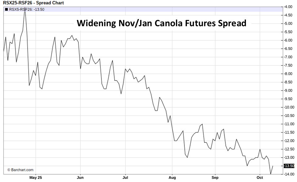 For today… canola futures are very narrowly mixed to start this morning…flat to less than $1/tonne either side of unchanged. Nov canola futures are up $0.40 this morning at $617.40/tonne…interesting from the perspective of a fourth consecutive session of modest gaining, but wide futures contract spreads (Nov-Jan) and weak Prairie cash basis continue to suggest overall weak market conditions. Until at least the dominant downward trendline is broken, it s hard to suggest anything bullish here.