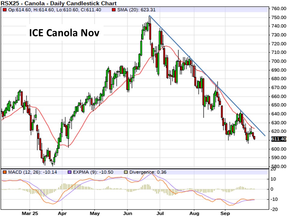 For today… canola futures are trading $4 to $6/tonne lower to start this morning. Nov canola futures are down $4.60 at $610.00/tonne, with the summer downtrend drawn off the June higher still firmly in place. Weaknesses in CBOT soybeans/soyoil and energy markets are also weighing on canola price action. EU rapeseed and Malaysian palm oil futures are also trending lower this morning.