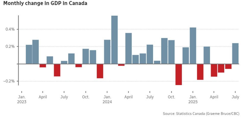 – Canada GDP grew in July… Canada’s monthly gross domestic product rebounded from three months of contraction to grow by 0.2% in July as mining, manufacturing and wholesale trade boosted growth, data showed on Friday. Canada’s GDP had shrunk in the second quarter by 1.6% annualized and economists were closely tracking the July GDP growth figure to get an indication of whether there will be a contraction in the third quarter. Two consecutive quarters of contraction is considered a technical recession.
