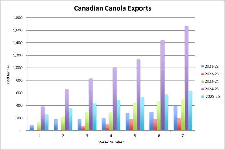 Canadian canola exports were weak at only 52,300 tonnes shipped in the week ending on September 21. The crop year to date export total for canola at the end of week seven is 627,400 tonnes. This total is 1.05 MMT less than last year’s pace. Canola exports have been hampered by the lack of Chinese business.