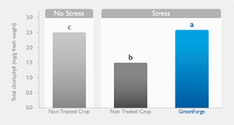 The data show that there is a considerable increase in chlorophyll content in the plants treated with GreenForge, obtaining statistically significant differences in comparison to the heat stress Control (CT) and with the normal Control (C) that has not suffer stress. The results obtained, confirm that GreenForge stimulates photosynthesis thanks to its influence on the expression of photosynthetic genes, thus increasing the accumulation of photosynthetic pigments, specifically chlorophyll. The decrease in the chlorophyll content in the heat stress Control can be due to the effect of oxidative stress owing to the accumulation of reactive oxygen species (ROS).