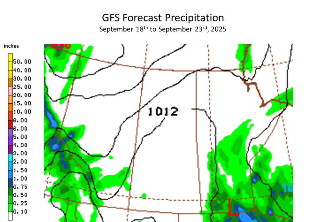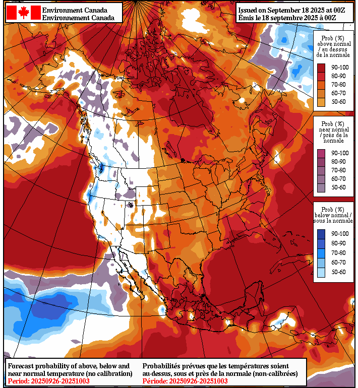 The long term forecast is indicating a large change in the weather pattern with troughing developing on the west coast and a strong ridging pattern continuing in central North America. This will bring warmer than normal temperatures in the eastern Prairies through the end of the month. The weather pattern should result in increased chances of rainfall in the western growing regions, while the eastern Prairies should remain mostly dry. This is good news as the harvest in the western Prairies should be essentially complete by then. This will give the eastern Prairies a chance to get back into the fields and catch up from the recent delays.
